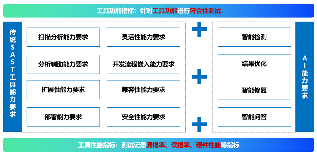 评估从用户视角出发,除功能层面 和性能层面 外,针对智能化能力进行具体规范, 涵盖检测能力要求 (包括扫描分析能力要求、灵活性能力要求、分析辅助能力要求、开发流程嵌入能力要求)、智能化能力要求 (包括智能检测、结果优化、智能修复、智能问答)、平台通用能力要求(包括扩展性能力要求、兼容性能力要求、部署能力要求、安全性能力要求)三大维度,具体架构图如下。
