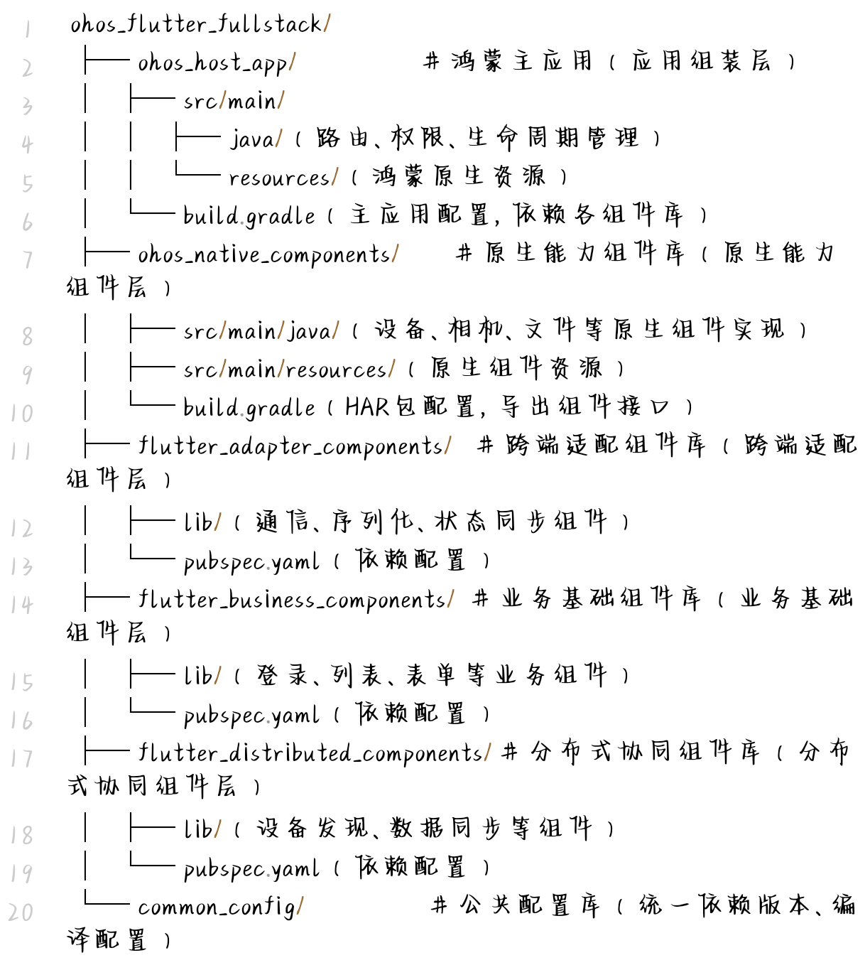 在全场景智慧生态布局下,企业级跨端应用不仅需突破"多设备适配、UI一致性、性能均衡"的基础诉求,更要实现"原生能力深度调用、分布式协同无缝衔接、工程化高效迭代"的进阶目标。开源鸿蒙(OpenHarmony)凭借分布式软总线、设备管理、数据同步等核心能力,构建了全场景应用的底层基座;Flutter则以组件化思想、自绘渲染引擎,解决了跨端开发中"开发效率与体验一致性"的核心矛盾。二者的深度融合并非简单的技术叠加,而是通过"组件化封装、接口标准化、协同自动化"的设计思路,打造"原生能力可复用、业务组件可组合、分布式能力可扩展"的跨端开发体系。本文结合极简代码示例,从技术原理、架构设计、组件实现、性能优化、工程化落地五个维度,全面拆解全场景跨端组件化的深度融合方案。