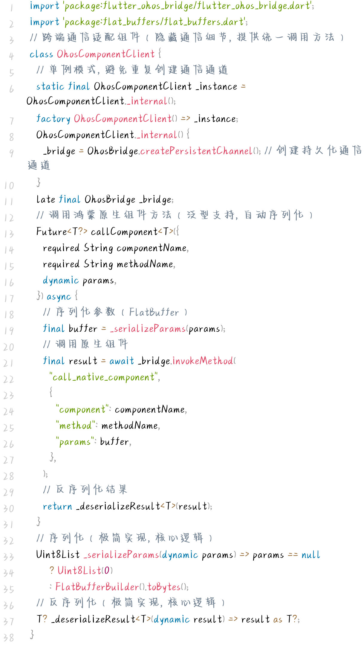封装Flutter与鸿蒙的通信逻辑,处理序列化/反序列化、组件调用路由,暴露简洁的调用接口给业务组件: