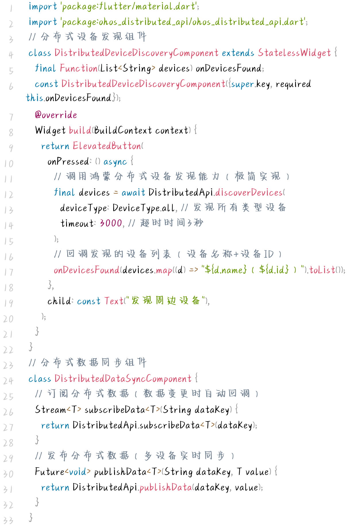 分布式协同组件层 封装开源鸿蒙分布式能力,支持跨设备协同 鸿蒙分布式API、Flutter Stream 设备发现组件、数据同步组件、跨设备流转组件