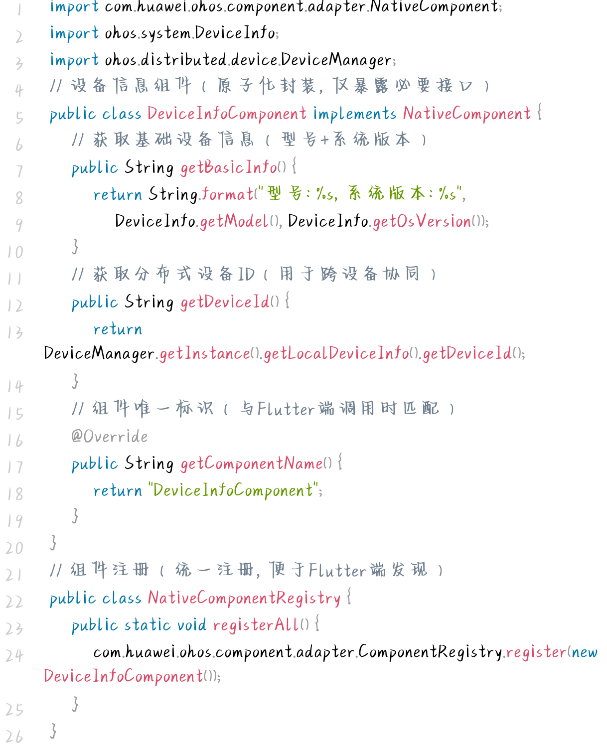 - 原子化封装:将单一功能(如设备信息查询、相机拍摄、分布式连接)封装为独立组件,组件内部隐藏实现细节,仅暴露标准化接口;