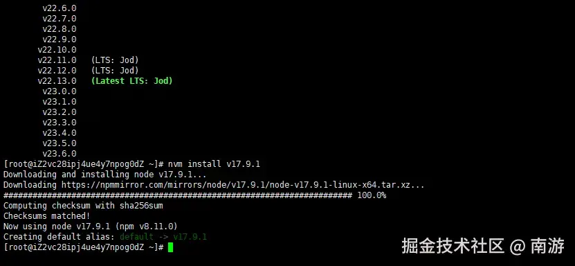 Alibaba Cloud Linux 2 和 CentOS 7.x 仅支持 Node.js 17.x 及以下版本,例如需要安装 v17.9.1,则执行nvm install v17.9.1。