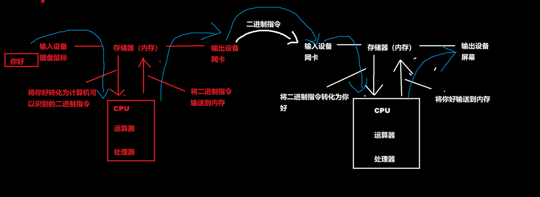 蓝色箭头为数据在冯诺依曼体系结构里面的整体走向