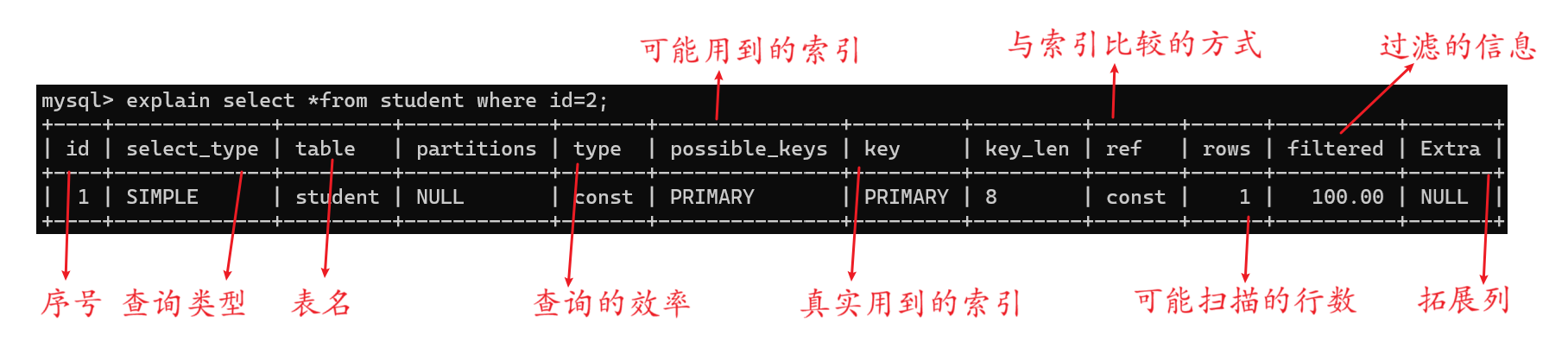 | 1 | SIMPLE | student | NULL | const | PRIMARY | PRIMARY | 8 | const | 1 | 100.00 | NULL |