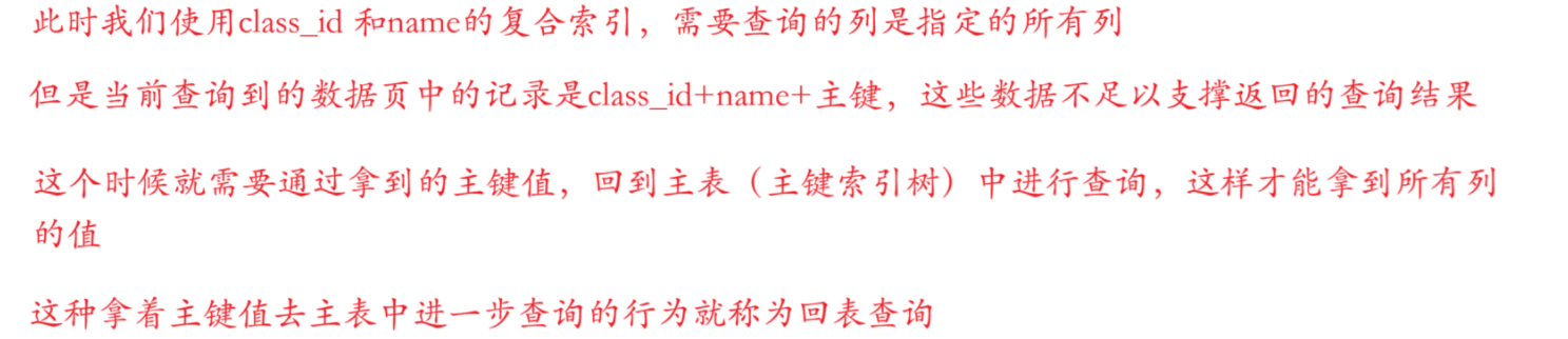 - InnoDB使⽤这个主键值来搜索聚集索引中的⾏,这个过程称为回表查询