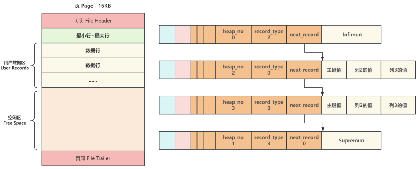此时第一个数据行有一个记录下一行地址偏移量的区域 next_record 将页内所有的数据行组成一个单向链表。当向这个新页插入数据时,会将最小行连接到第一个数据行,最后一行真实数据连接到最大行,随着更多的数据插入,会按照主键从小到大的顺序进行链接: