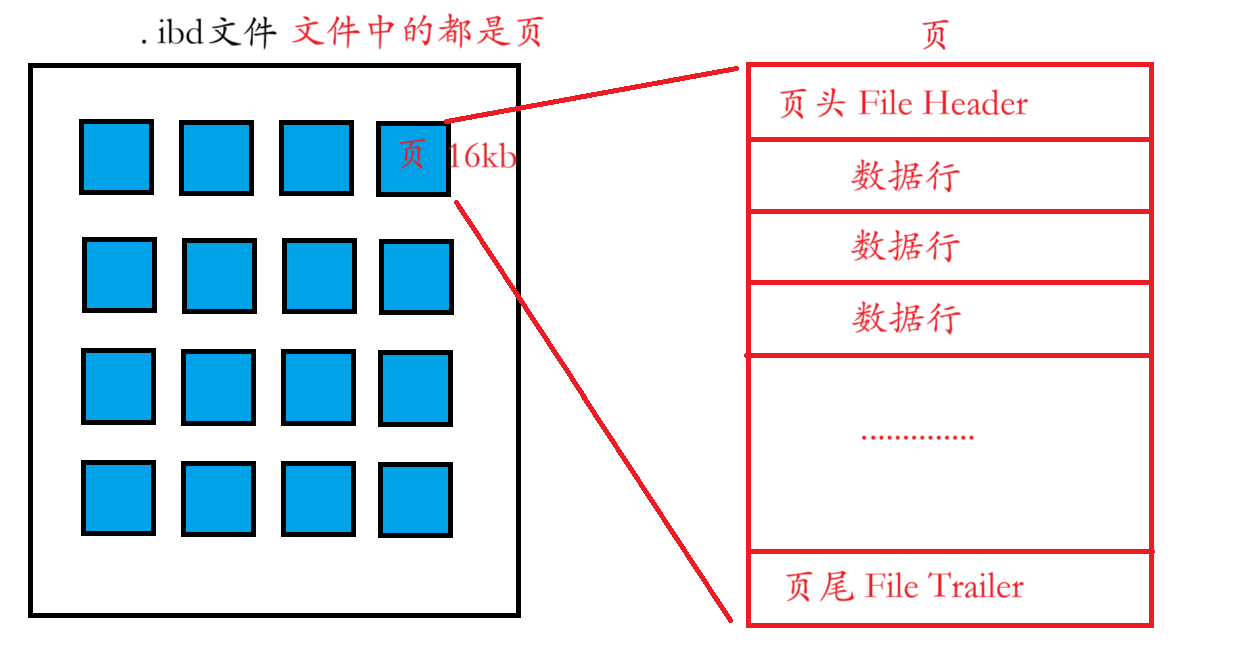 在.ibd文件中的结构体就是页,页是内存与磁盘交互的最小单元,**默认大小为16kb,**每次内存与磁盘进行交互时最少会从磁盘中读取一页(也就是读取16kb大小的数据),磁盘中每个页内部的地址都是连续的