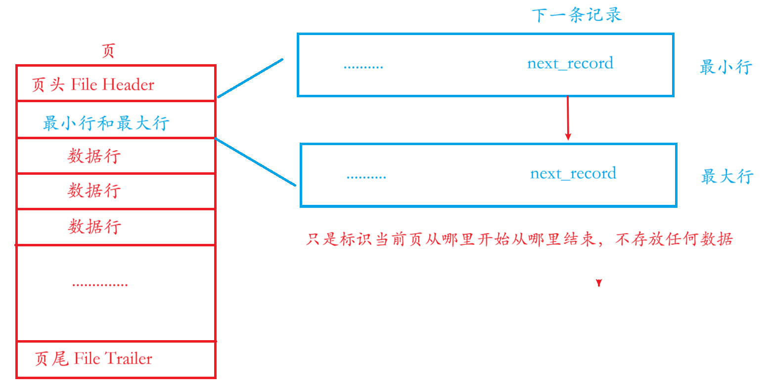 页主体的部分区域才是保存真实数据的主要区域,当创建一个新的页时,都会自动分配两行,一个是页内最小行一个是页内最大行,这两行不存储任何真实的数据,而是数据行链表的头和尾