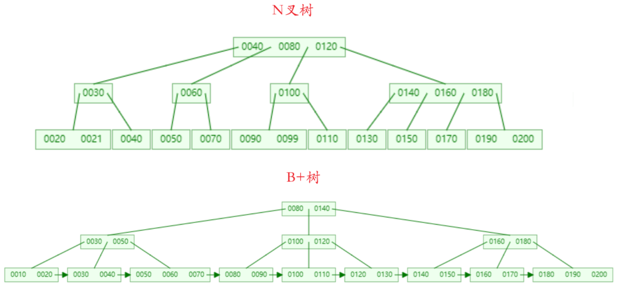 B+树是一种经常用于数据库和文件系统等场合的平衡查找树,我们MySQL种索引默认采用的就是这个数据结构,那么我们来看看B+树和N叉树的区别: