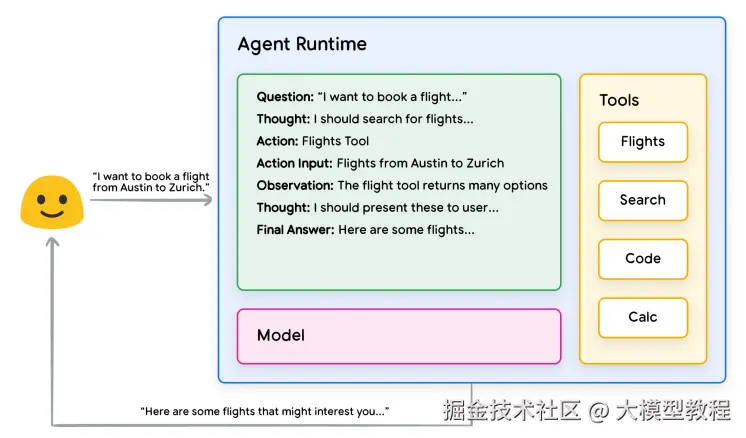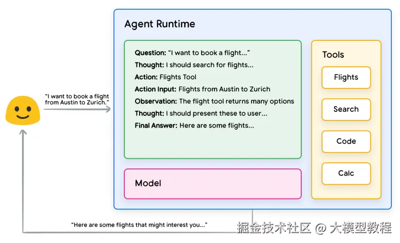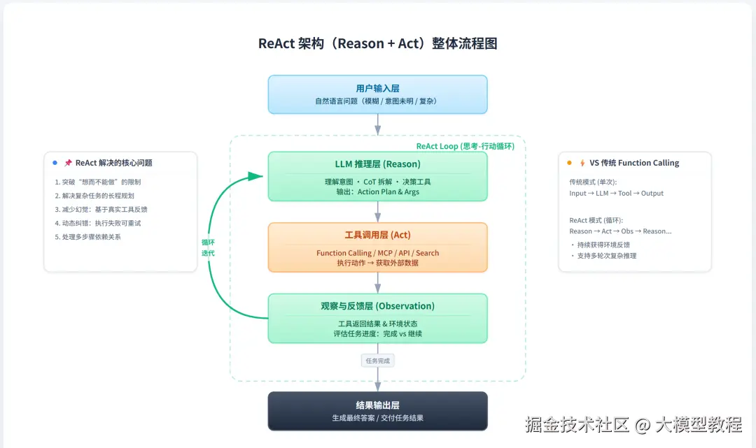 在 ReAct 框架下,Agent重复执行思考(Thought)→行动(Action)→观察(Observation) 的循环,直到产生最终答案。