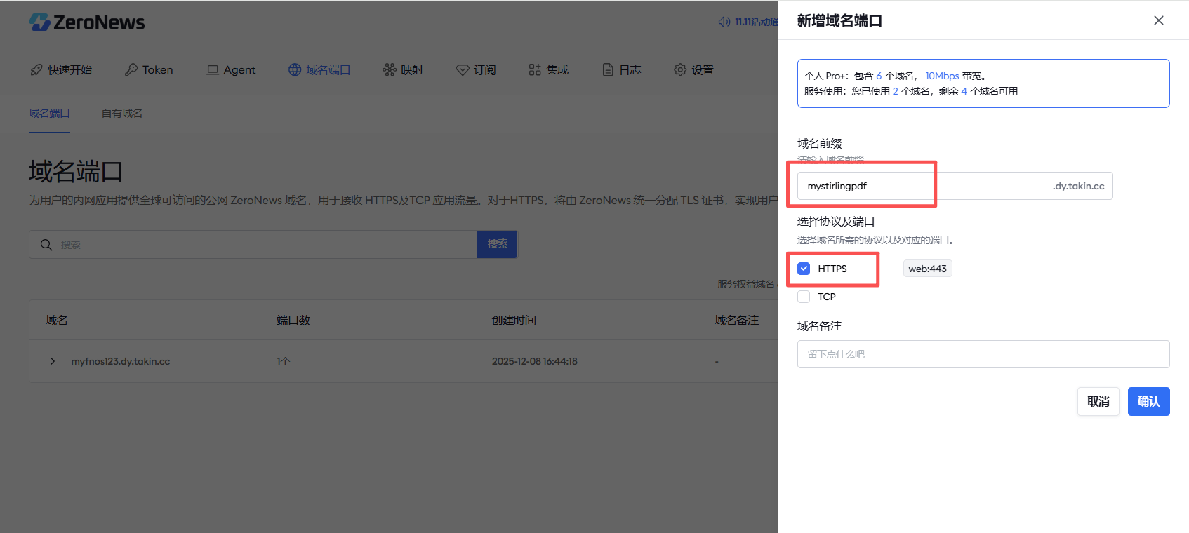 3、 接着,我们在域名端口页面,创建一个可用的公网域名 ,并勾选HTTPS 协议端口。