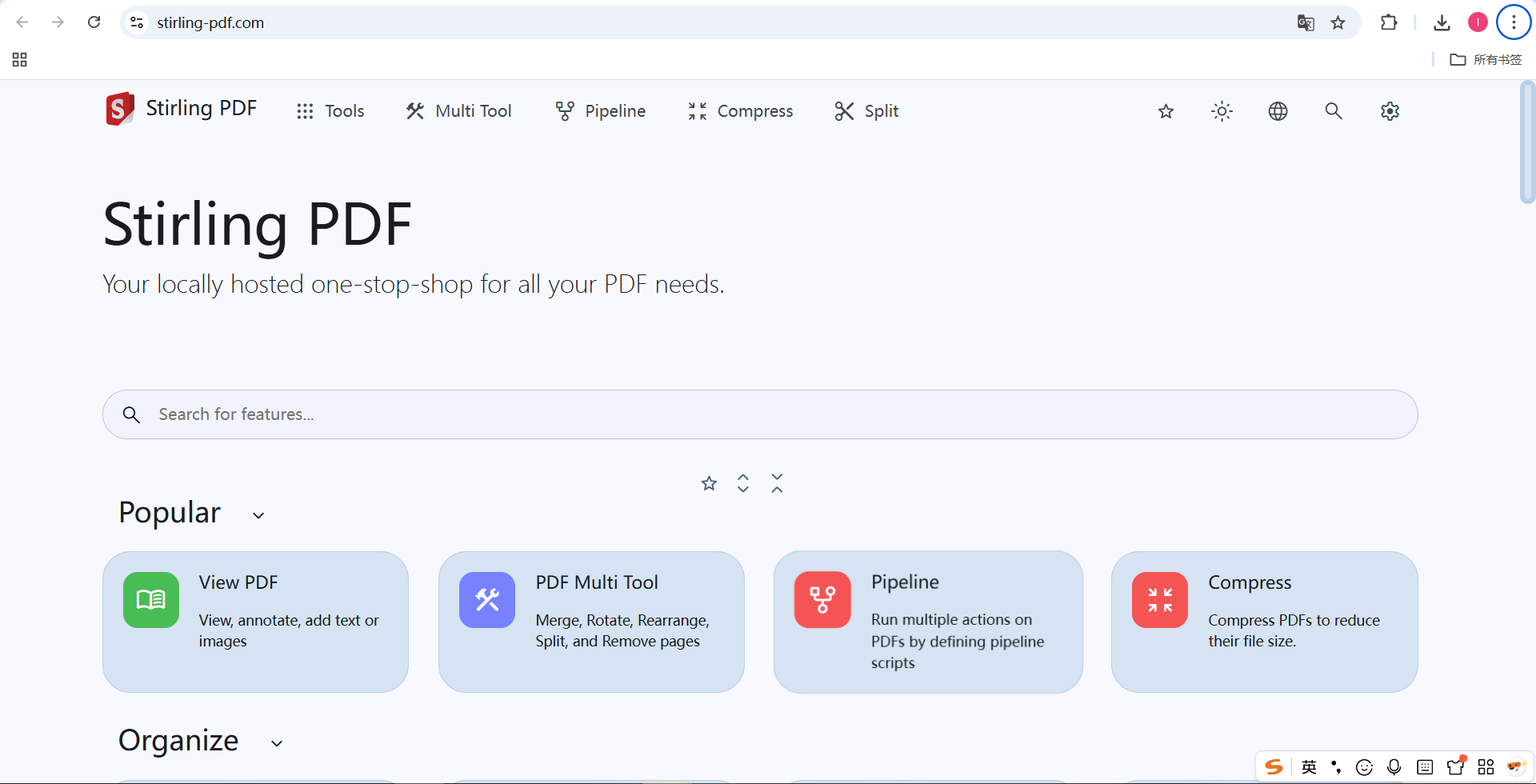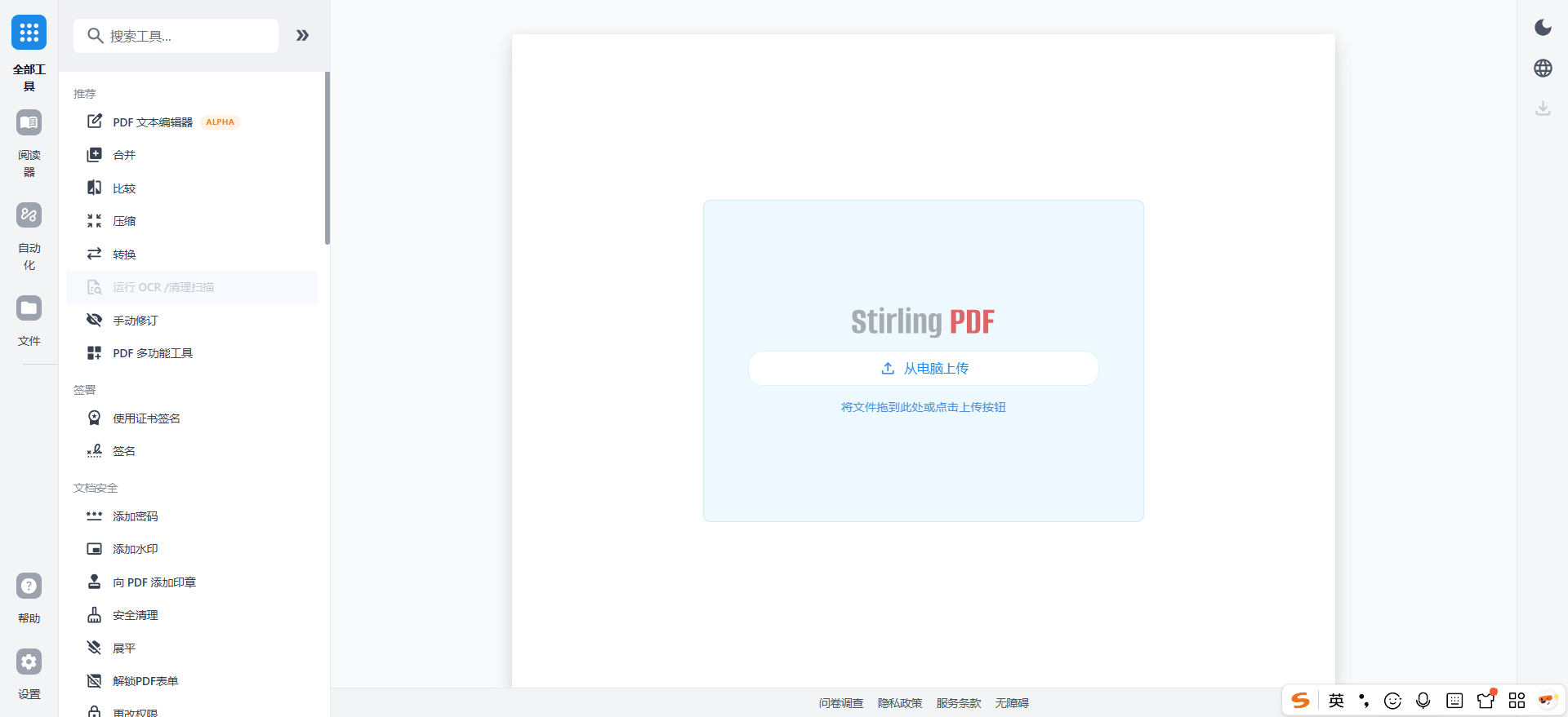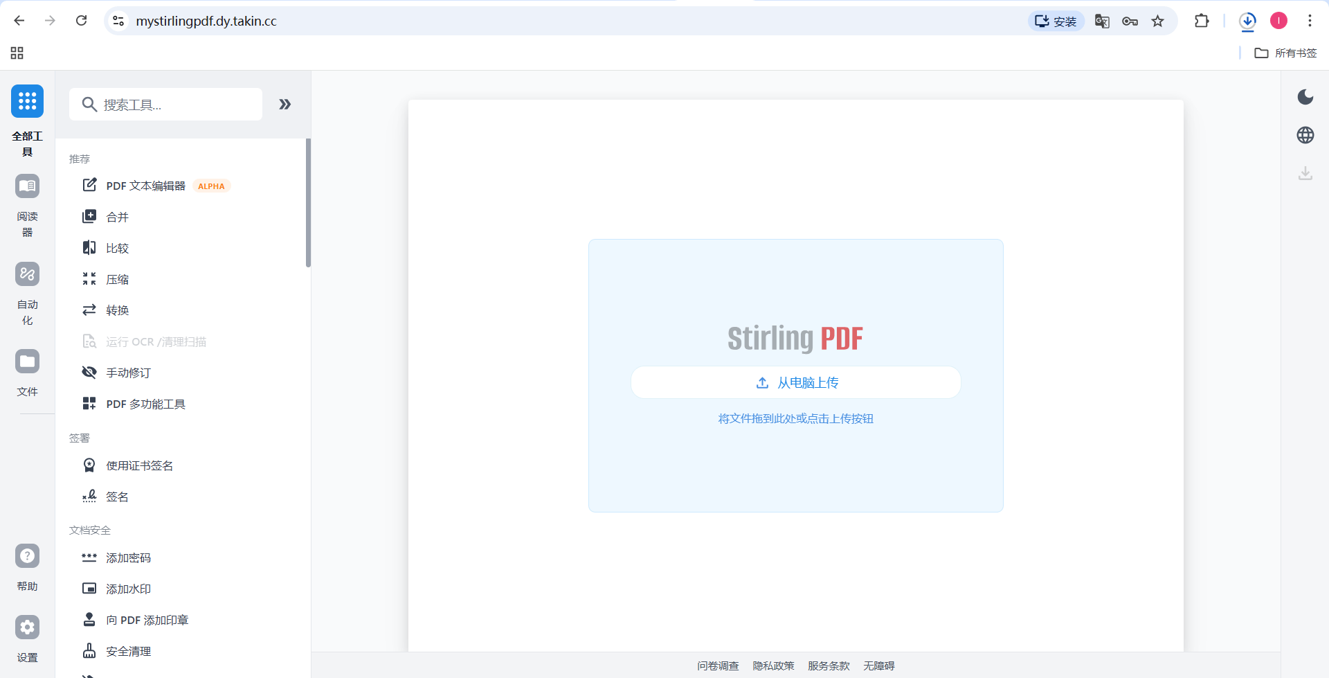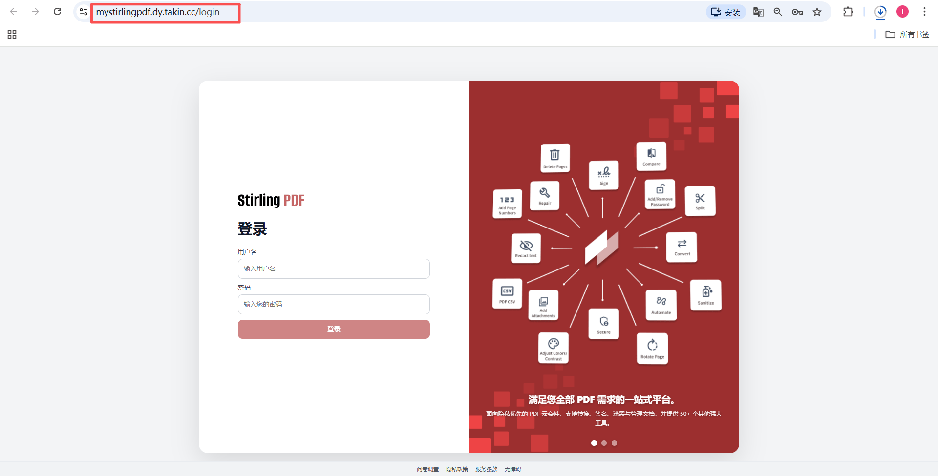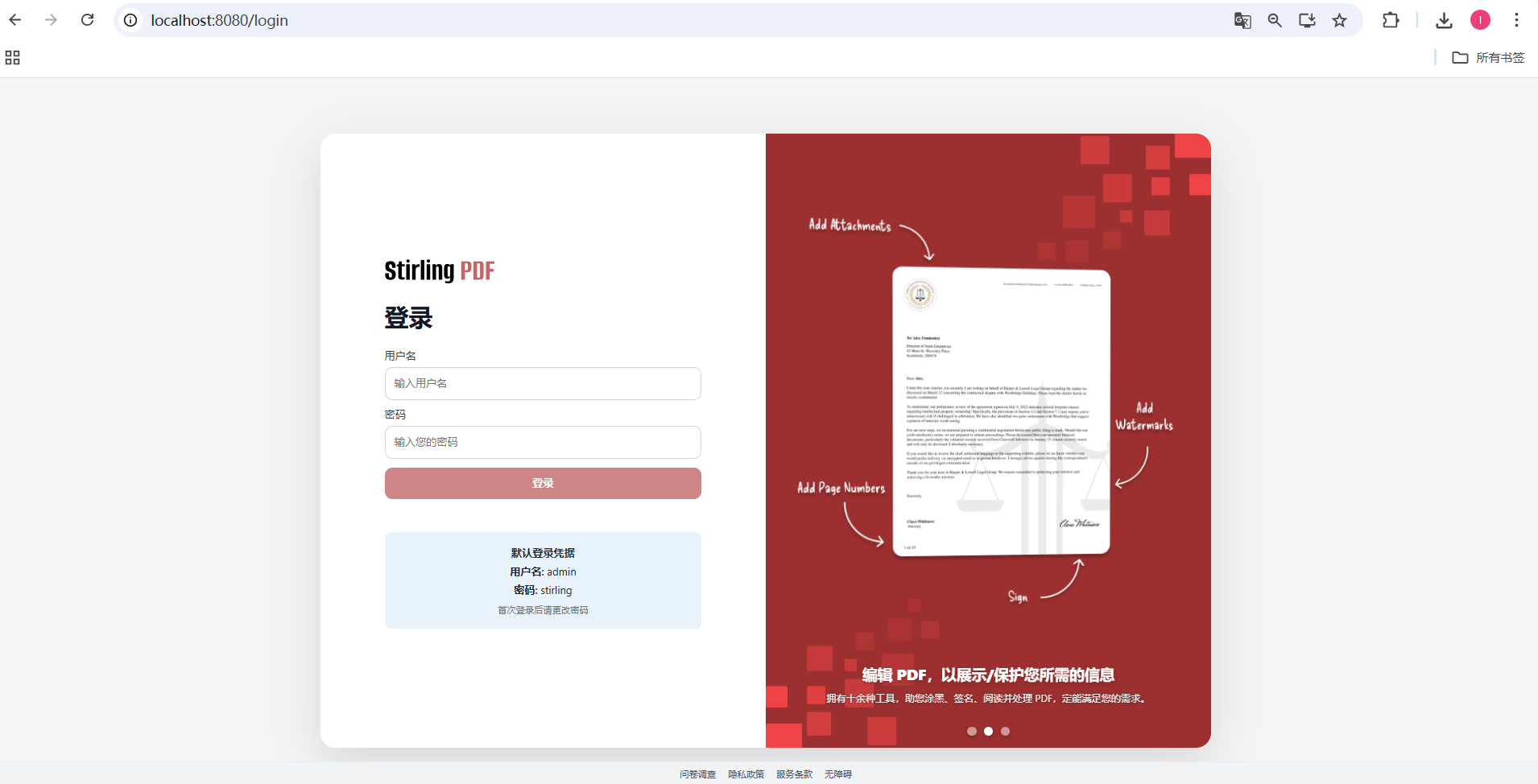 - 就可以打开刚安装的 Stirliing-PDF 服务器,然后输入下方展示的默认账号密码即可
