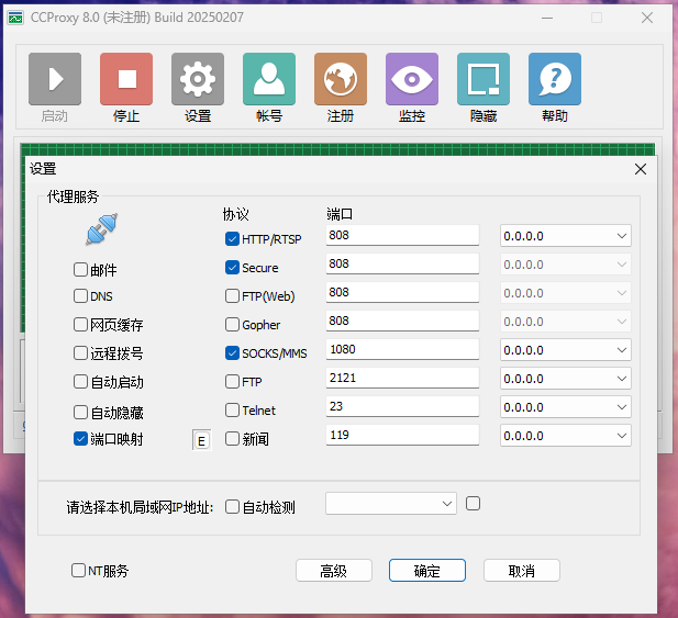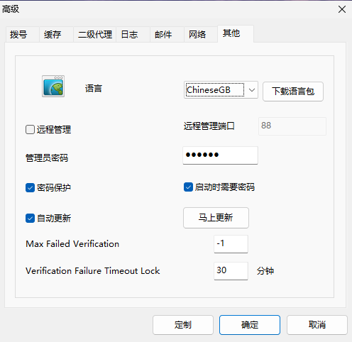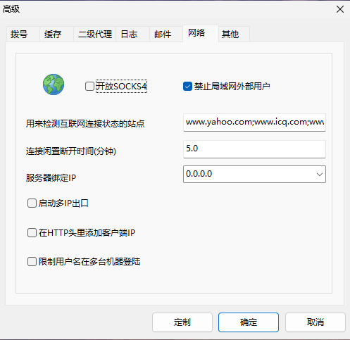 为了安全性,点击上图"高级"按钮,配置禁止局域网外部用户使用此代理与管理员密码