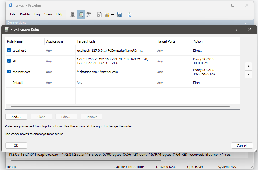 所有访问 VPN 内网的流量都通过 Proxifier 精准分流到对应的虚拟机