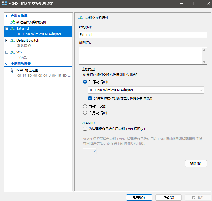 - 两个网卡( 如果你不需要WSL2中Ubuntu系统访问ClaudeCode或不需要通过各个单位VPN访问内部资源如Linux服务器,也可以忽略这个要求, 这主要是解决WSL内Ubuntu因为走了Nat网络,网关也被改过,如果虚机使用了主机相同的网卡,Ubuntu内无法联通虚机ip问题**)**