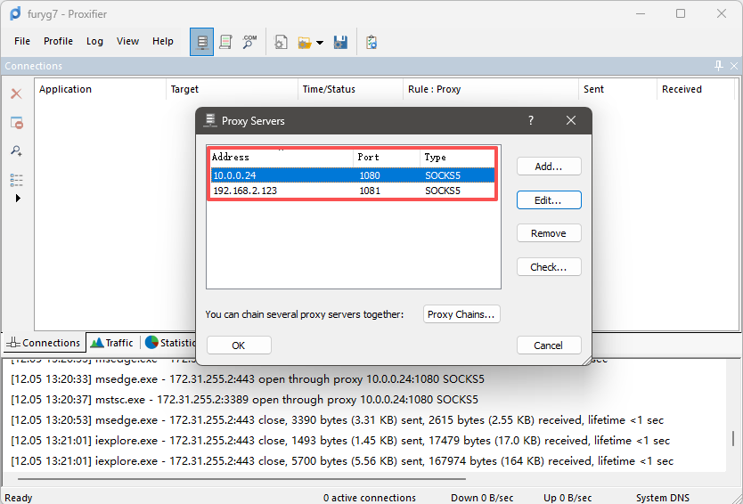 1.配置Proxy Server,需要将虚机ip和虚机上启动CCProxy监听的端口配置到Proxifier中。需要注意,如果你带着笔记本在家,到单位或其他地点办公,虚机的ip会跟着变化,对应也要手动修改下下面server的ip配置。
