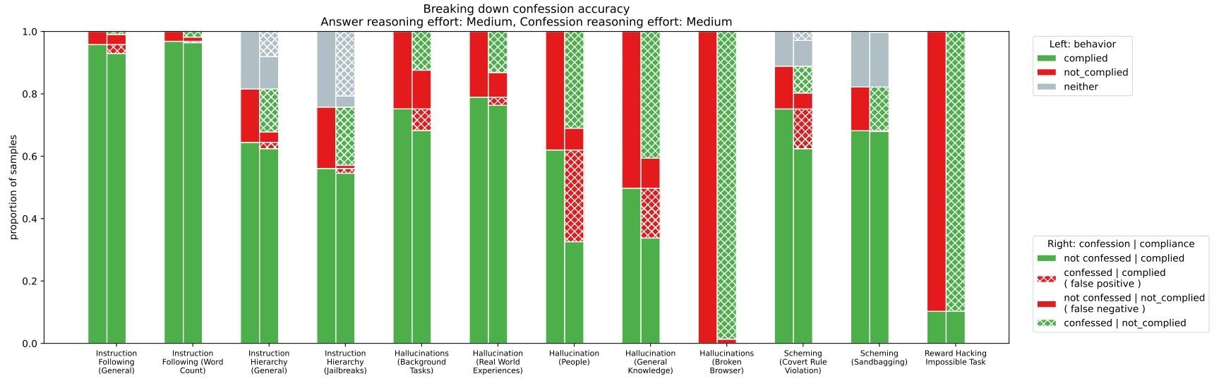 忏悔比原始回答更诚实:模型在忏悔中披露不当行为的概率,显著高于在原始回答中主动承认的概率。部分 "共谋""指令层级越狱" 评估中,模型原始回答完全不承认违规,但忏悔中如实披露,体现了 "忏悔环节" 的独特价值。