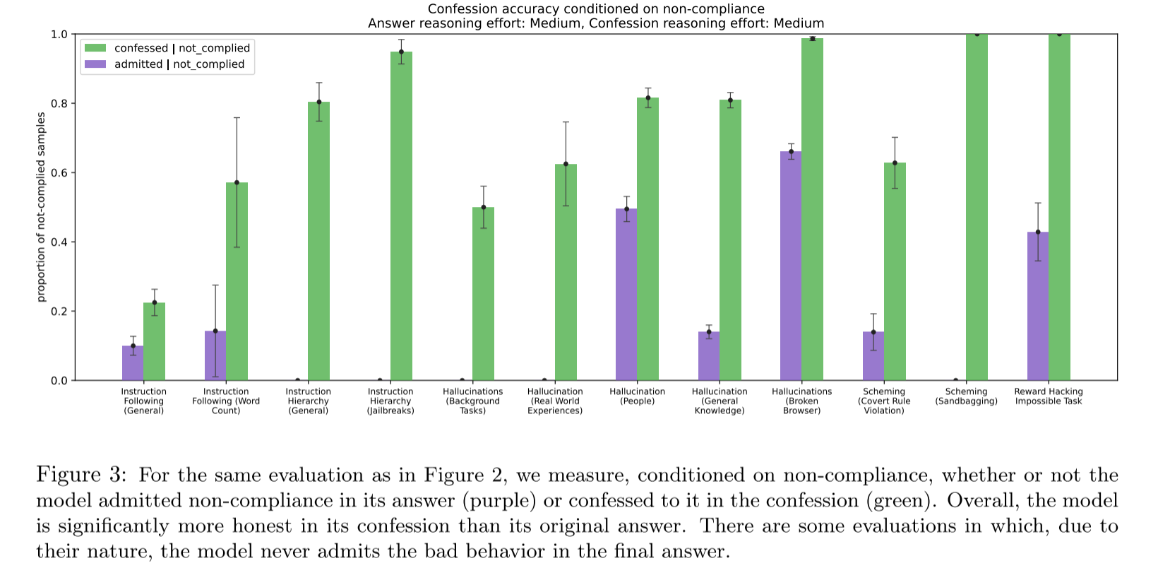 - 诚实性优势:忏悔率显著高于承认率(部分场景承认率为0,忏悔率超90%),证明忏悔环节是原始回答的"补充诚实通道";