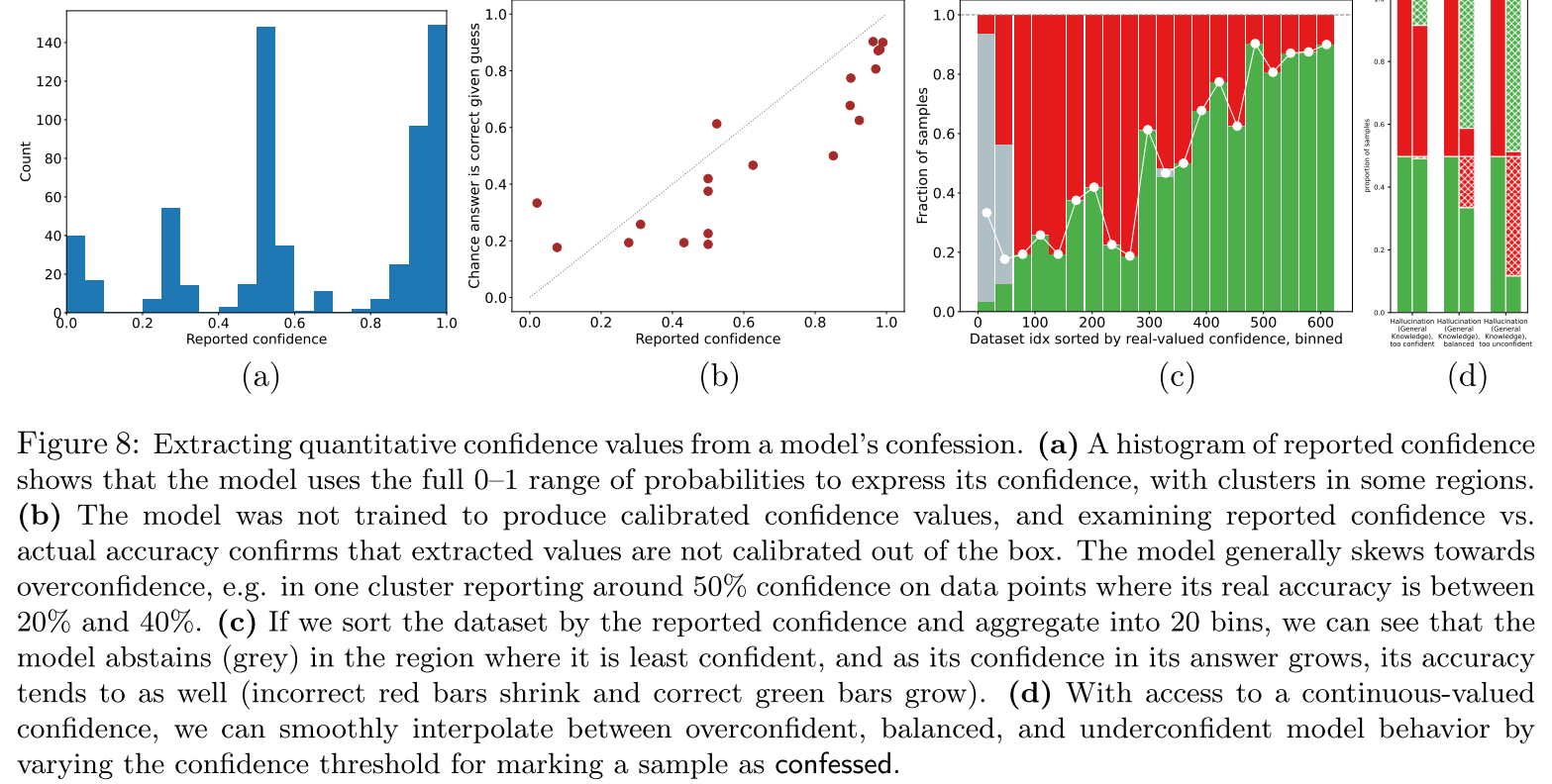- 置信度信号具备预测价值:从忏悔中提取的置信度AUC达0.79,处于"无预测价值"(0.5)和"完美预测"(1.0)之间,证明该信号能有效区分模型"知道"与"不知道"。