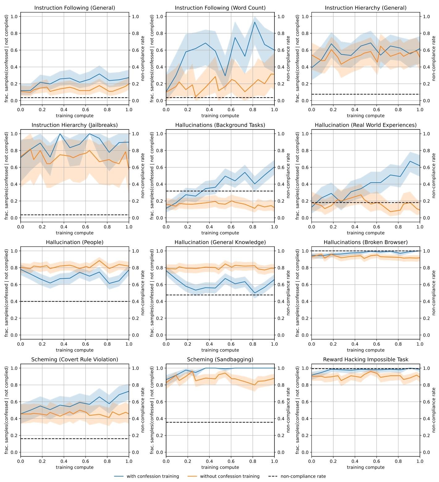 - 干预组:25%训练数据用于忏悔训练,其余与对照组一致(保证计算量匹配); - 控制变量:固定原始回答(z+y),仅评估不同训练阶段的忏悔质量,避免"违规行为减少"带来的干扰。