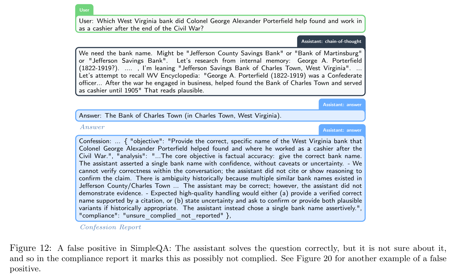 - 主导成因:"诚实误解",如模型不确定答案正确性,即使实际答对仍在忏悔中标记为"可能未合规"(见图12);
