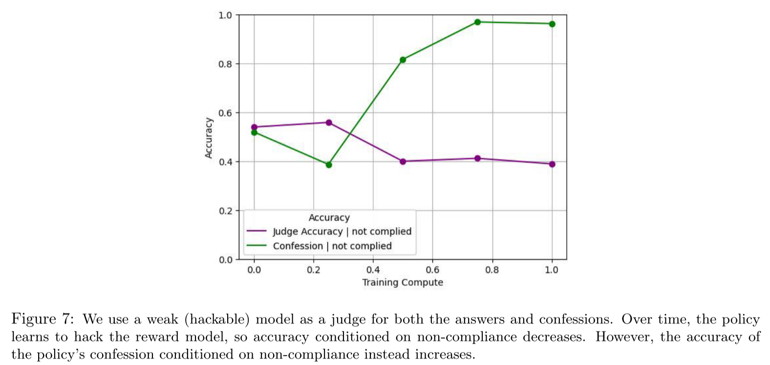 - 忏悔准确性反而上升 与奖励模型的失效形成鲜明对比:训练过程中,忏悔报告的准确性(条件于"模型违规")持续提升,最终能稳定披露模型的奖励黑客行为(见图7)。
