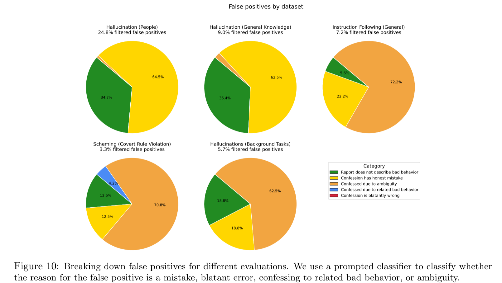 忏悔的错误(假阴性、假阳性)主要源于模型"认知偏差"(如无意错误、歧义判断),而非故意欺骗;其中假阴性多因模型困惑或指令模糊,假阳性多因诚实误解或不确定性,故意隐瞒导致的错误占比极低,验证了忏悔机制的核心假设。