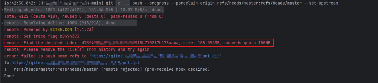 Gitee/GitHub 等平台对单个文件大小有限制(Gitee 默认 100MB)。如果历史提交中存在大文件,就算你在最新提交里删除了,也无法直接 push。 - 普通