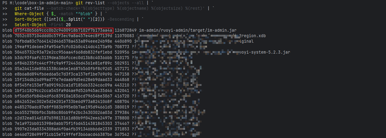 在 Windows PowerShell 中,可以使用如下命令找出仓库中最大的文件: