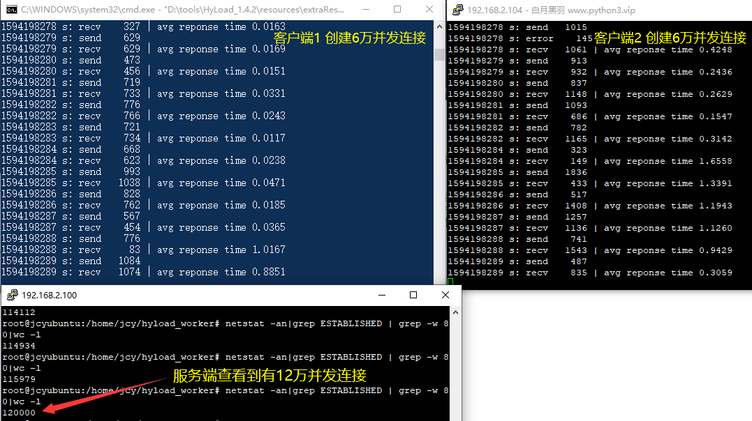 这样 1台电脑 ,里面再跑3台虚拟机,就可以给服务端加压 24 万的并发连接,如下图所示: