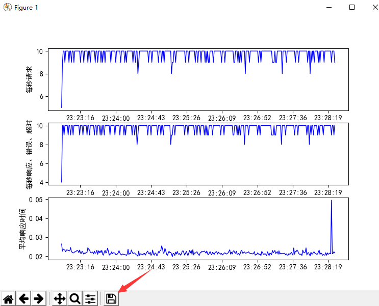 第2张表蓝色曲线是TPS,红点(如果有的话)表示每秒错误数量,红十字(如果有的话)表示每秒超时数量.