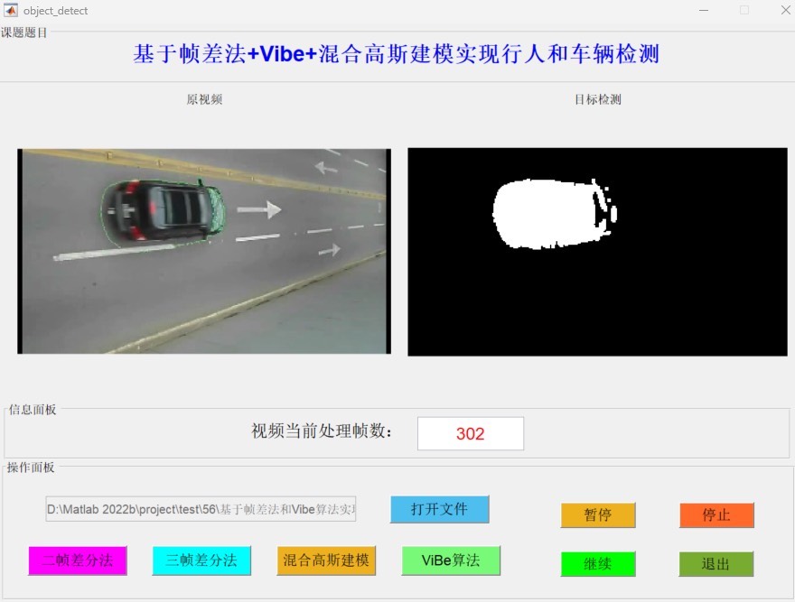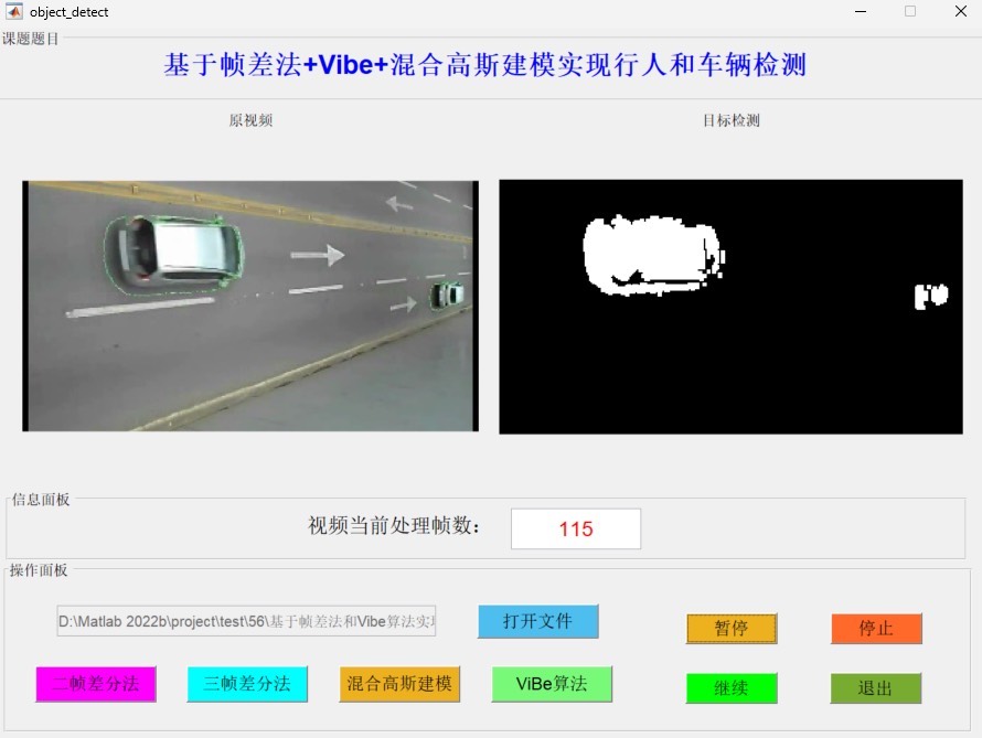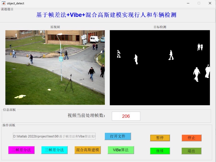 基于matlab的行人和车辆检测系统 【目标检测】基于计算机视觉,含GUI界面 算法:二帧差分法,三帧差分法,混合高斯建模,ViBe算法。 功能:对视频中出现的动态目标进行逐帧作差分析或ViBe算法检测,使运动的行人或汽车与背景分割出来,达到检测目的。 代码结构清晰,含有注释,运算速度快,可扩展。