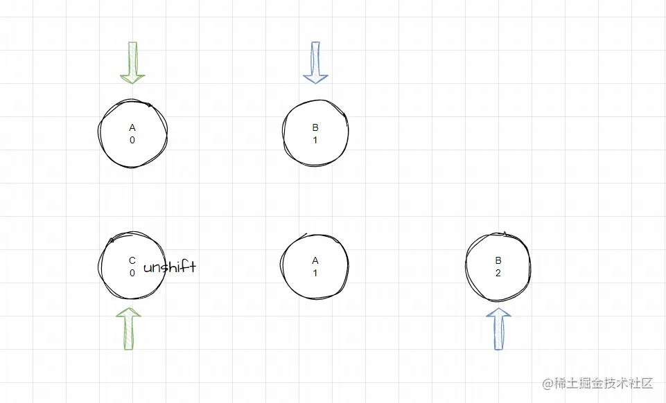 如下图,首先上面是旧节点,下面是新节点,新节点上在数组最前面新加了一个C节点,因为key是index,所以此时C的key还是0,但是文本是C,并不是A。