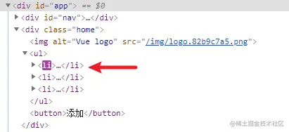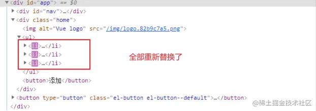 接下来,我们使用数组渲染一组儿子节点小li,并且通过事件在数组的头部增加(unshift)一个数据;当key为index的时候,我们查看下图图片渲染的情况发现所有的小li都变化了,而key为id的时候,则只在li的最前面新加了一个小li,这就是diff算法根据key判断产生的差异性,具体在下面来看一看。
