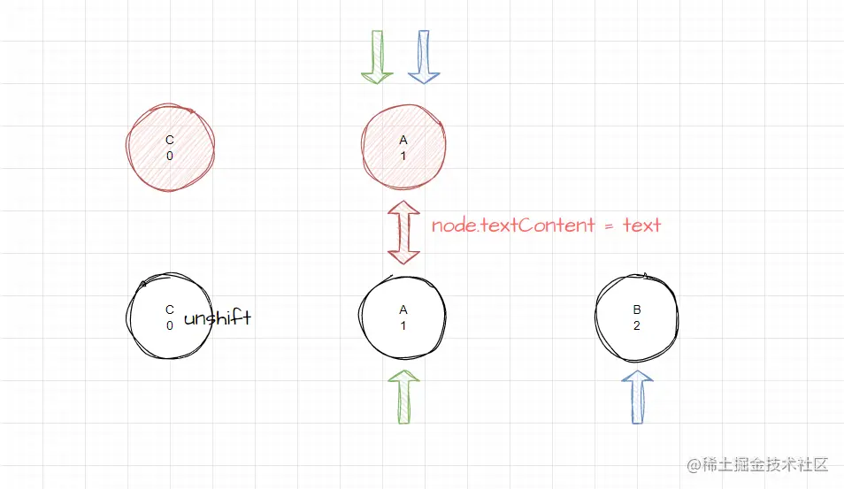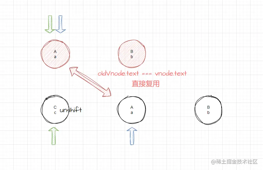 第一组对比完成之后,新旧节点的索引会依次增加,对比第二组,第二组的key也是一样的,会重复第一组的对比方式,最后将旧节点文本替换成新节点文本node.textContent = text