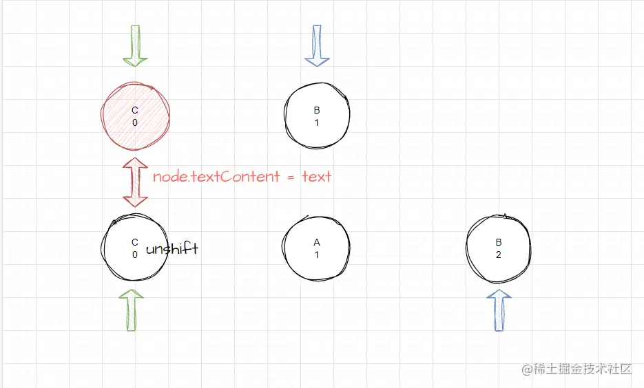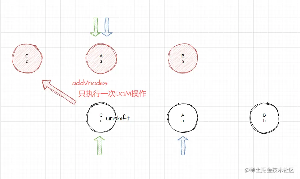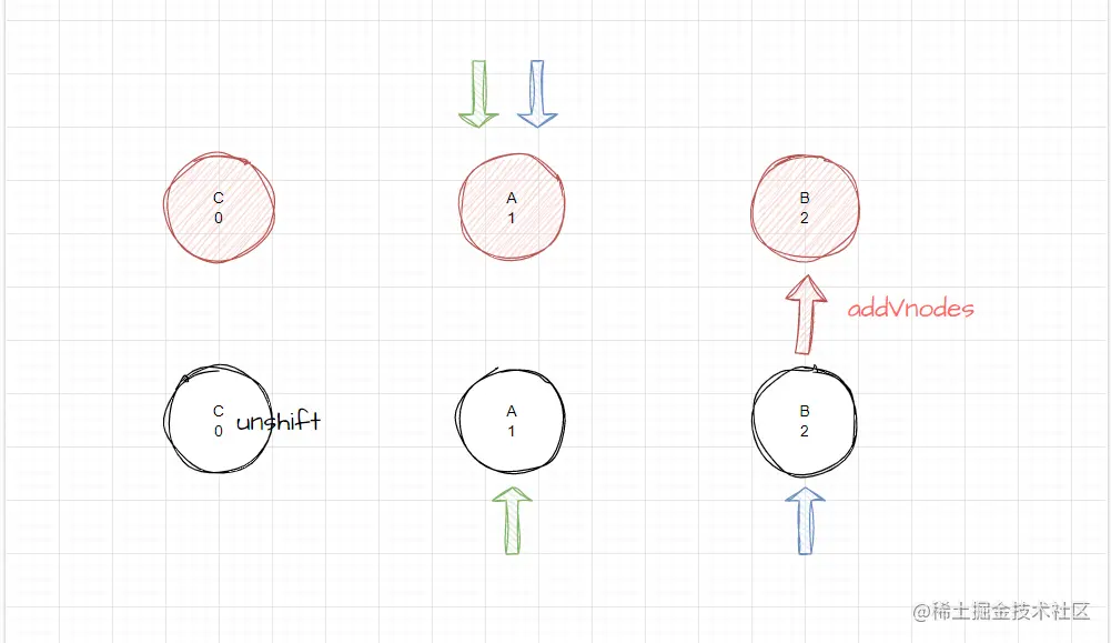 lis[0].textContent = 'C',** 一直到循环结束**oldStartIdx <= oldEndIdx && newStartIdx <= newEndIdx,此时把多的新节点添加(addVnodes)进去,或者多的老节点删除(removeVnodes**)掉。