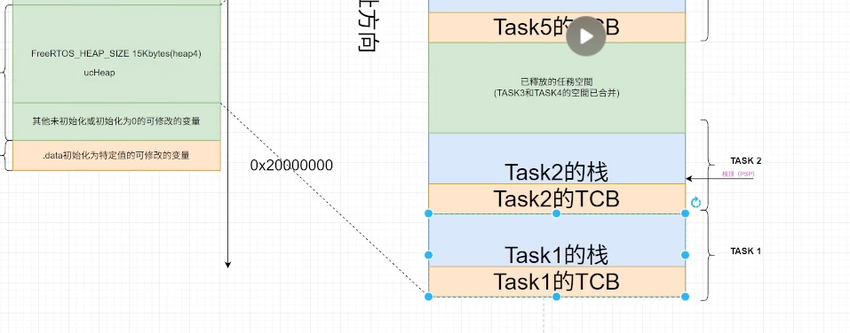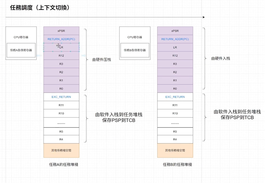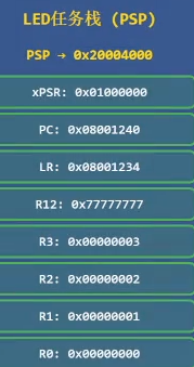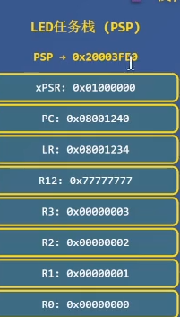 - 当在执行某个任务进行切换的时候,psp栈指针会向下移动(栈指针从高地址往低地址移动),此时发生硬件压栈(从r0->r3,r12,lr,pc,xpsr),压进当前psp所指向的栈里面