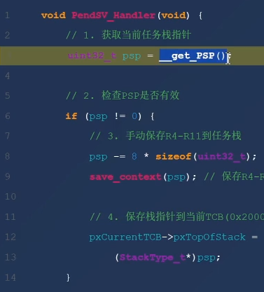 接着在保存完寄存器以后,找到当前任务的tcb地址,并把当前任务栈的指针地(PSP)址存到tcb第一个成员pxTOPOfStack保存起来,以方便后续回复任务进行弹栈