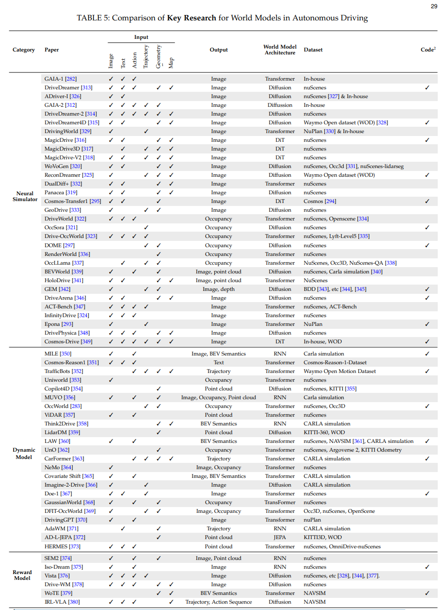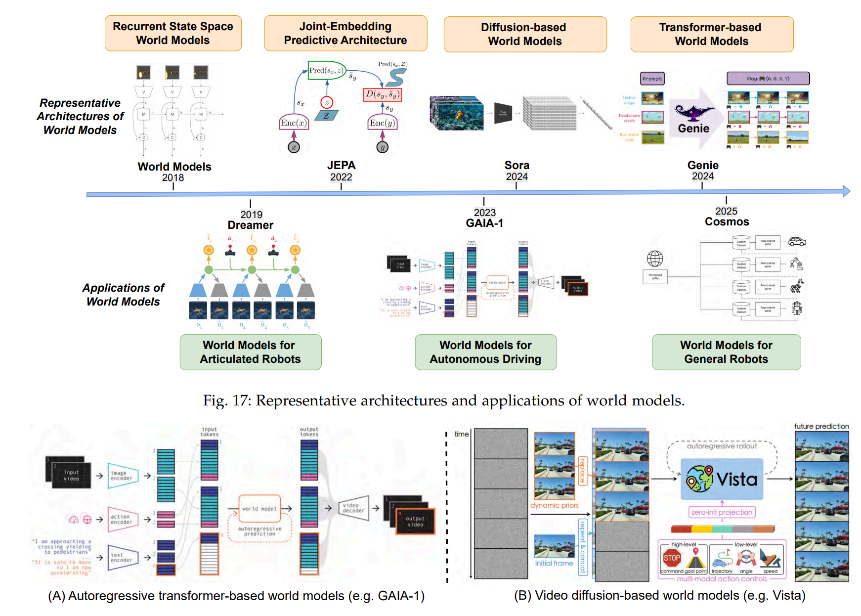 **• 世界模型的最新进展:**首先回顾世界模型的主要架构及其潜在作用,例如作为具身智能的可控仿真器、动力学模型和奖励模型;此外,全面讨论了专为自动驾驶和关节机器人等特定应用设计的最新世界模型。