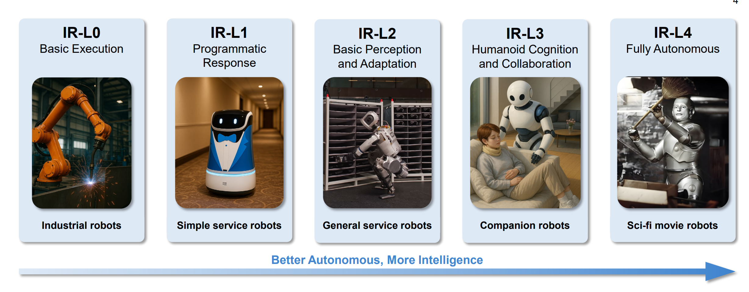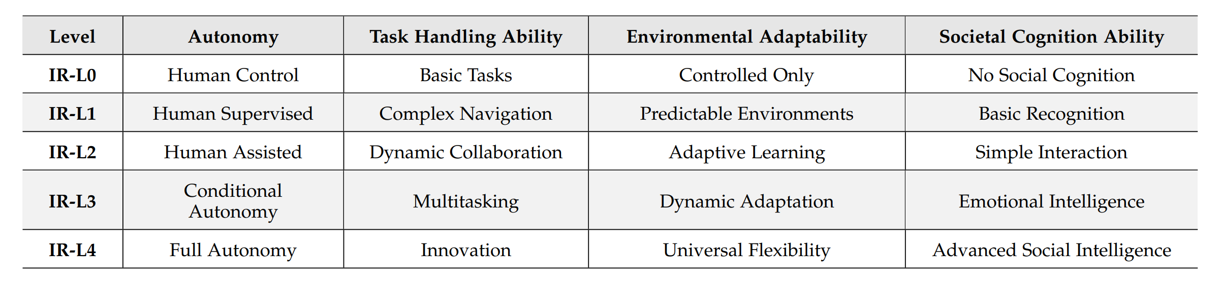 **• 智能机器人等级划分:**提出人形机器人自主性评估的五级分级标准(IR-L0至IR-L4),涵盖自主性、任务处理能力、环境适应性和社会认知能力四个关键维度。