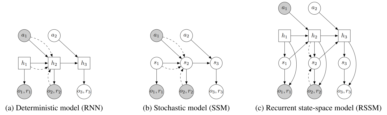 图24:潜在动态模型采用不同的过渡机制进行时间预测。(a) RNN模型使用确定性过渡,限制多模态未来预测,同时便于规划器利用。(b) 状态空间模型(SSM)仅依赖随机过渡,阻碍长期记忆保持。(c) RSSM结合随机和确定性状态分量,平衡多路径预测与时间连贯性。这种混合方法在学习多样化未来的同时保持序列一致性,从而提升鲁棒性,如[429]所示。