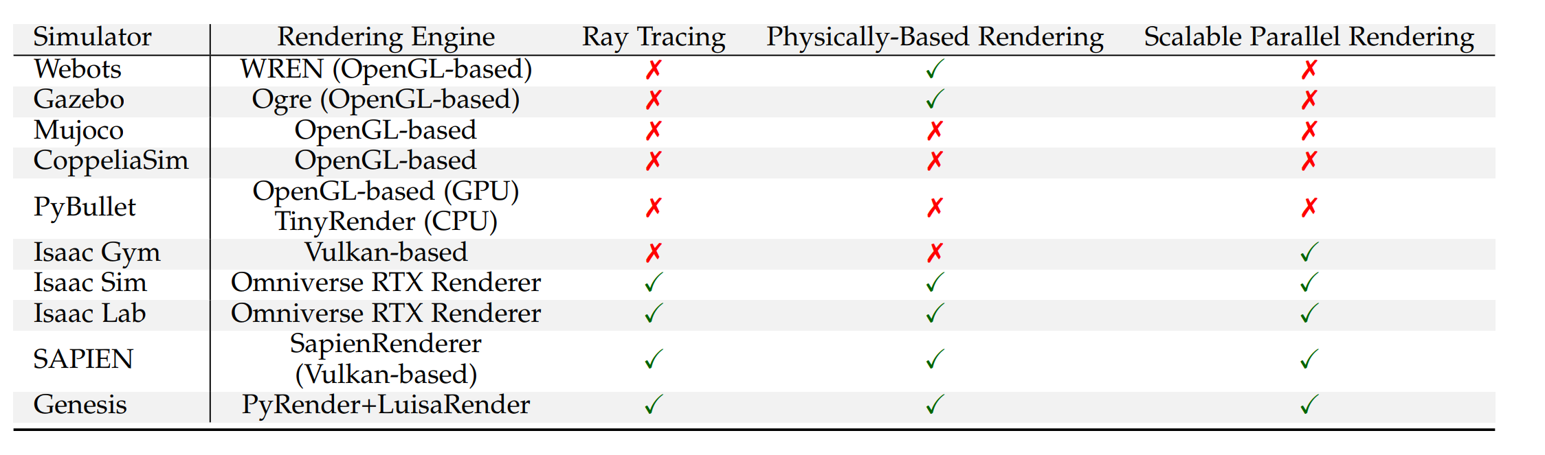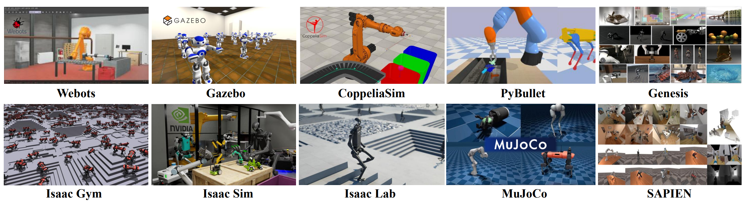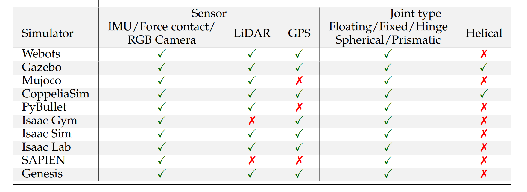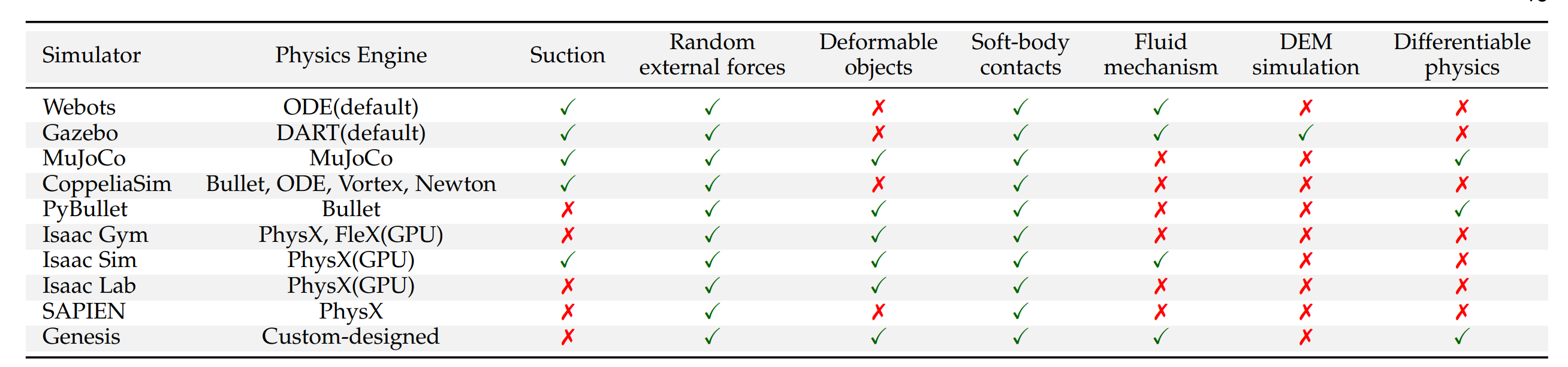**• 物理仿真器分析:**对主流仿真器(Webots、Gazebo、MuJoCo、Isaac Gym/Sim/Lab等)进行综合对比分析,涵盖物理仿真能力、渲染质量及传感器支持。