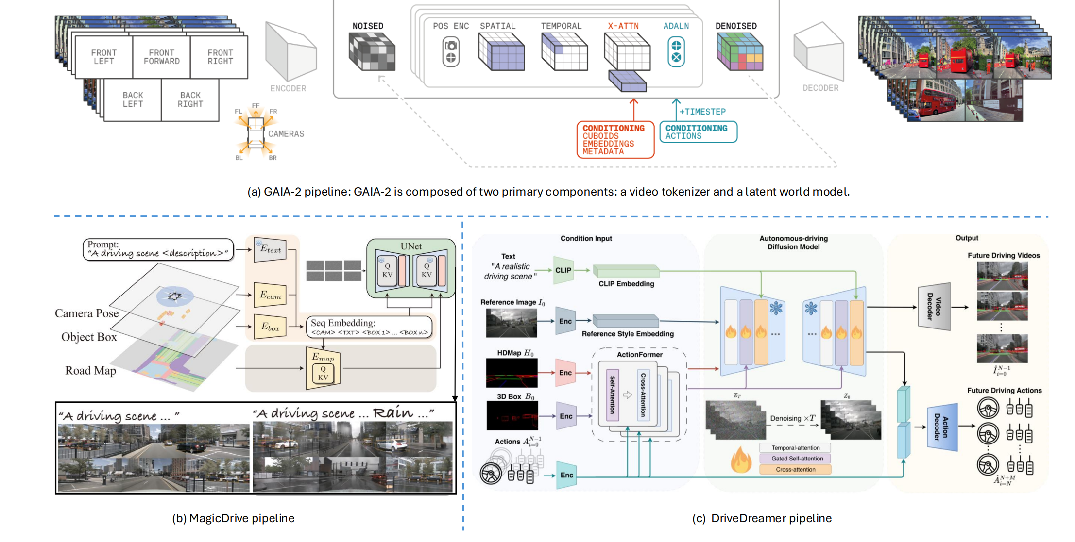 **多模态集成与可控场景生成:**近年来,自动驾驶世界模型已从简单的图像到图像生成,发展为能够整合多种输入类型的先进多模态系统,包括摄像头图像、LiDAR点云、文本描述、车辆轨迹和高清地图。这一演变解决了自动驾驶测试中的根本挑战:需要生成特定且可控的驾驶场景,以在精确设定的条件下对驾驶系统的不同方面进行压力测试。GAIA-2和DriveDreamer-2等模型通过接受结构化输入(如自车动力学、多智能体配置、环境因素(天气、时段)和道路语义)来实现对生成场景的精细控制,体现了这一趋势。这种多模态方法还支持生成同步的多摄像头视图,实现360度覆盖。这些进展已将世界模型转变为能够主动探索各种可能驾驶场景的仿真工具,从而更高效地验证自动驾驶系统。