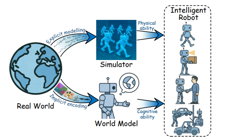 图1:物理模拟器和世界模型在具身智能中发挥关键作用。物理模拟器提供了对现实世界的显式建模,为机器人提供了一个受控环境,使其能够训练、测试和优化行为。世界模型提供了环境的内部表征,机器人能够在认知框架内自主模拟、预测和规划行动。