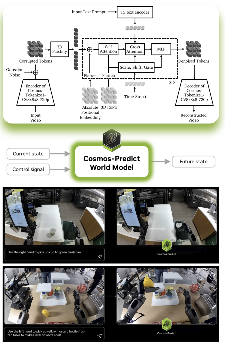 图23:Cosmos-Predict World Foundation Model通过Cosmos-Tokenize1-CV8×8×8-720p处理输入视频,将其编码为受高斯噪声扰动的潜在表示。3D分块步骤对这些潜在表示进行结构化,随后是迭代的自注意力、文本条件交叉注意力和MLP块,由自适应层归一化调节。最后,解码器从精炼后的潜在空间重建高保真视频输出。该架构支持多样化的物理AI应用中的鲁棒时空建模 [294]。