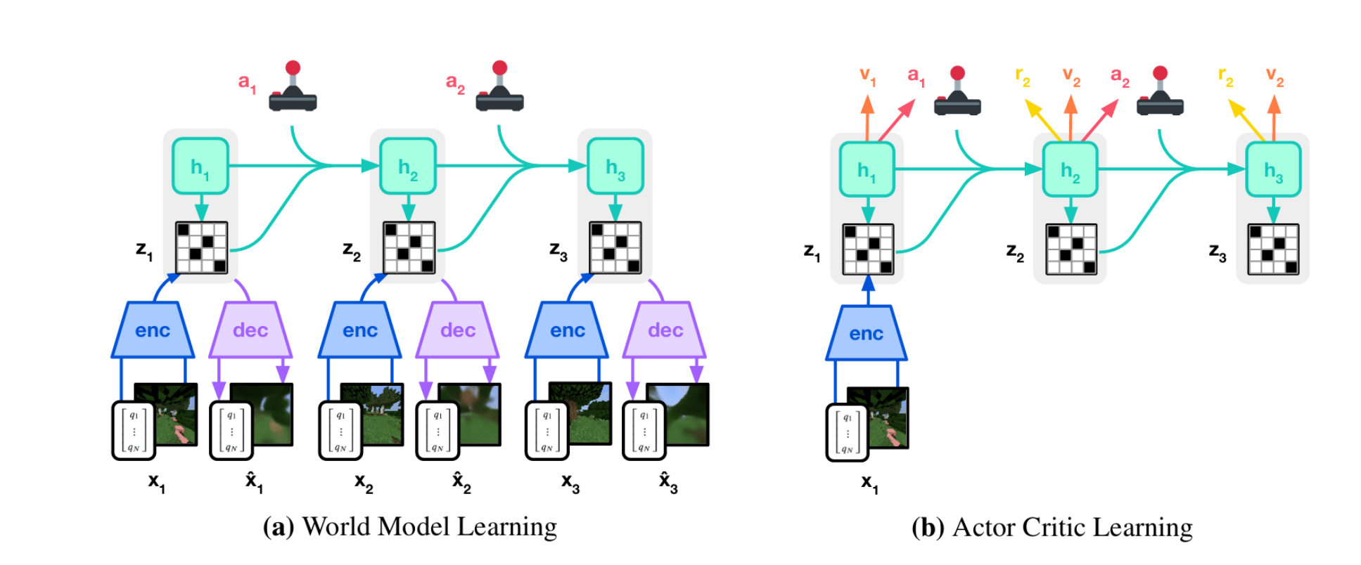 DreamingV2 [396] 在此基础上融合DreamerV2的离散潜状态与Dreaming的无重建学习,构建混合世界模型,该模型利用分类状态表示处理复杂环境,并结合对比视觉建模,在3D机械臂任务中无需重建即可表现出色。