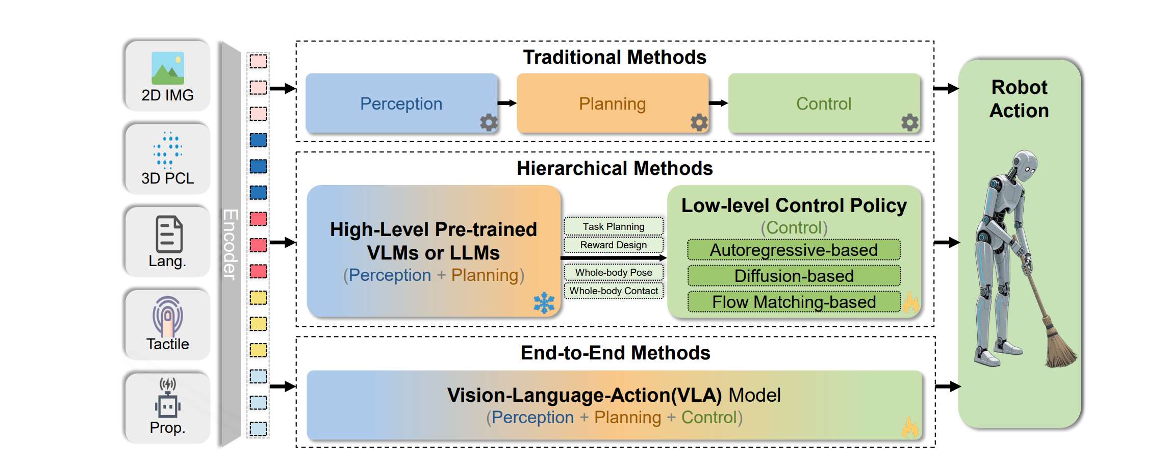 **• 机器人学习技术分析:**系统回顾智能机器人在腿式运动(双足行走、跌倒恢复)、操作(灵巧控制、双手机能协调)及人机交互(认知协作、社会嵌入性)领域的最新进展。
