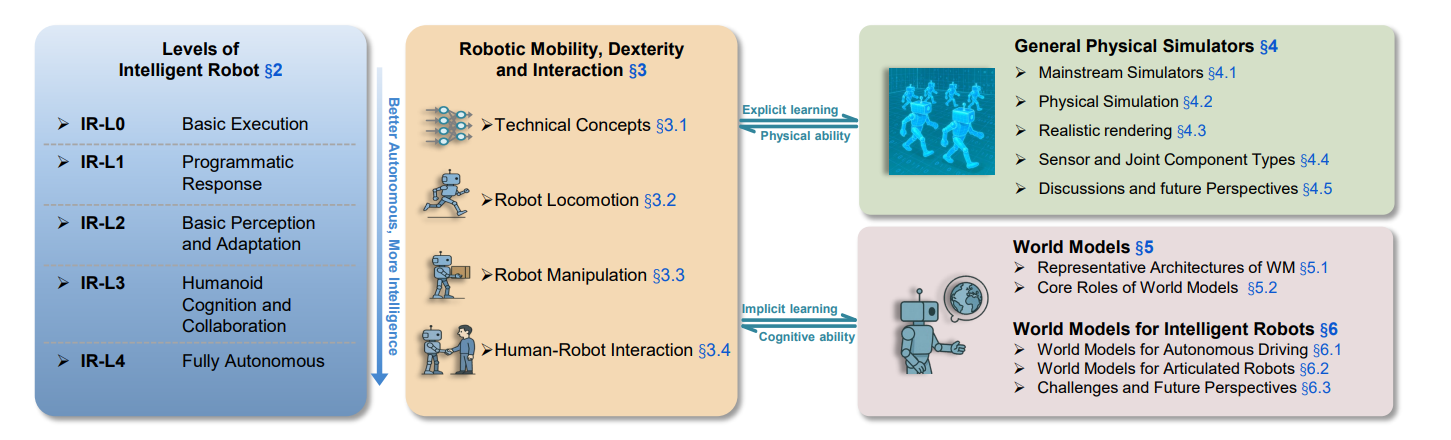 图2:综述大纲:我们将智能机器人发展分为五个级别(IR-L0至IR-L4),并综述了机器人移动、操作和交互方面的进展与关键技术(§3)、物理仿真器在学习和控制算法验证中的应用(§4),以及世界模型作为内部表征在学习、规划和决策中的设计与应用(§5--§6),强调显性和隐性学习路径,以更拟人化的方式[6]。