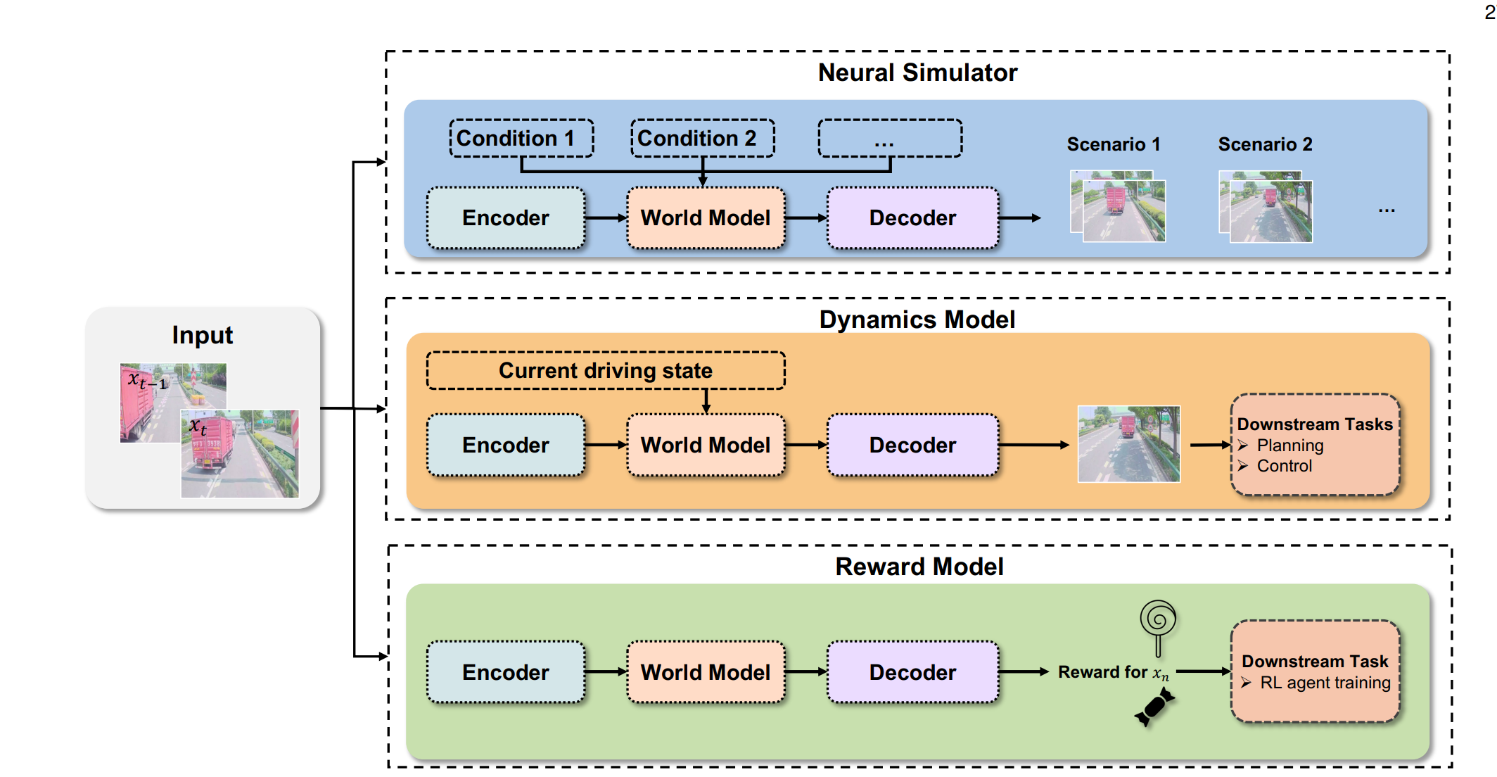 世界模型作为神经模拟器,通过学习多模态输入(如文本、图像、轨迹)生成时间连贯且语义丰富的物理环境表征。这些生成式模型为传统物理模拟器提供了可扩展、数据驱动的替代方案,能够高效训练和评估自主智能体。