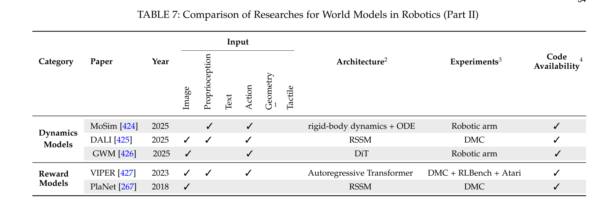 2 DiT = 扩散Transformer;RSSM = 循环状态空间模型;TSSM = Transformer状态空间模型;SSM = 状态空间模型;TD-MPC = 时序差分模型预测控制;OSRP = 在线安全奖励规划;GRU = 门控循环单元;MLP = 多层感知机;LSTM = 长短期记忆;GS = 高斯泼溅;MVM = 掩码视频建模;FM = 流匹配;JEPA = 联合嵌入预测架构。